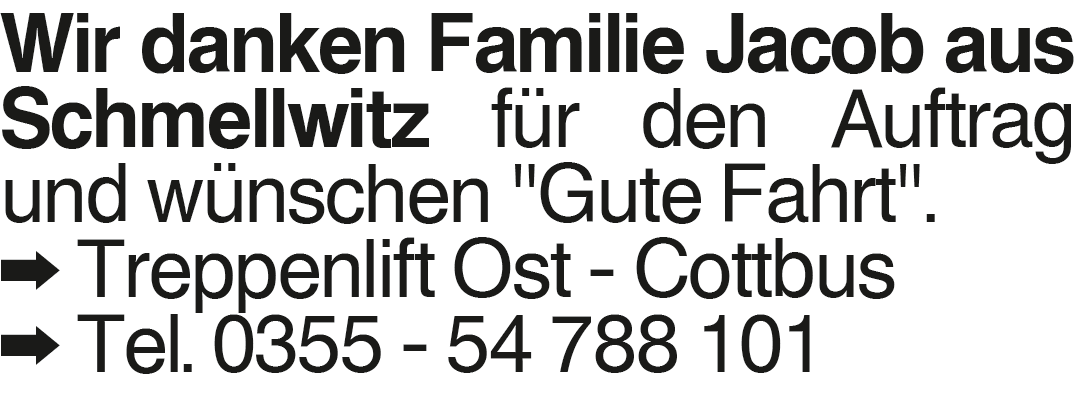 Wir danken Familie Jacob Wir danken Familie Jacob aus Schmellwitz für den Auftrag und wünschen Gute Fahrt . Treppenlift Ost - Cottbus Tel. 0355 - 54 788 101Das könnte Sie auch interessieren