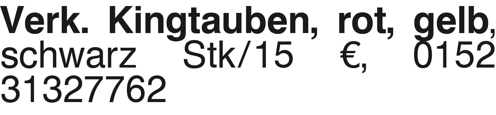 Verk. King Tauben, rot, g Verk. Kingtauben, rot, gelb, schwarz Stk/15 EUR, 0152 31327762Das könnte Sie auch interessieren