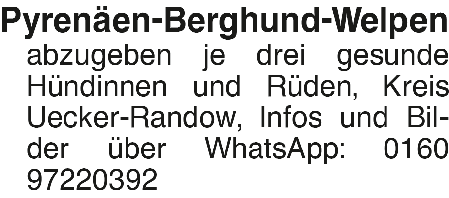 Pyrenäen-Berghund-Welpen Pyrenäen-Berghund-Welpen abzugeben je drei gesunde Hündinnen und Rüden, Kreis Uecker-Randow, Infos und Bilder über WhatsApp: 0160 97220392Das könnte Sie auch interessieren