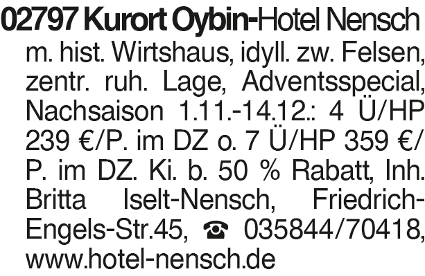02797 Kurort Oybin-Hotel 02797 Kurort Oybin-Hotel Nensch m. hist. Wirtshaus, idyll. zw. Felsen, zentr. ruh. Lage, Adventsspecial, Nachsaison 1.11.-14.12.: 4 Ü/HP 239 EUR/P. im DZ o. 7 Ü/HP 359 EUR/P. im DZ. Ki. b. 50 % Rabatt, Inh. Britta Iselt-Nensch, Friedrich- Engels-Str.45, 035844/70418, www.hotel-nensch.deDas könnte Sie auch interessieren