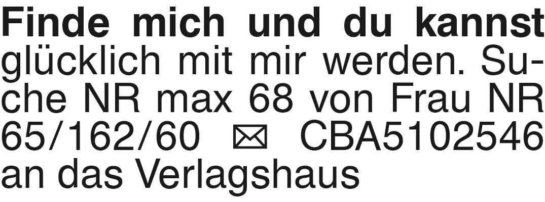 Finde mich und du kannst Finde mich und du kannst glücklich mit mir werden. Suche NR max 68 von Frau NR 65/162/60 CBA5102546 an das VerlagshausDas könnte Sie auch interessieren
