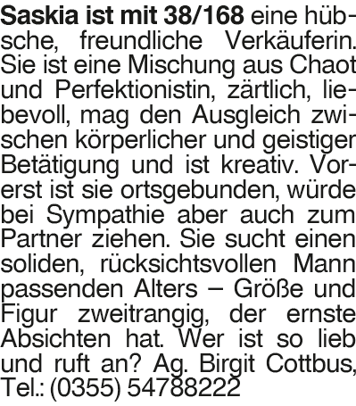 Saskia Saskia ist mit 38/168 eine hübsche, freundliche Verkäuferin. Sie ist eine Mischung aus Chaot und Perfektionistin, zärtlich, liebevoll, mag den Ausgleich zwischen körperlicher und geistiger Betätigung und ist kreativ. Vorerst ist sie ortsgebunden, würde bei Sympathie aber auch zum Partner ziehen. Sie sucht einen soliden, rücksichtsvollen Mann passenden Alters # Größe und Figur zweitrangig, der ernste Absichten hat. Wer ist so lieb und ruft an? Ag. Birgit Cottbus, Tel.: (0355) 54788222Das könnte Sie auch interessieren