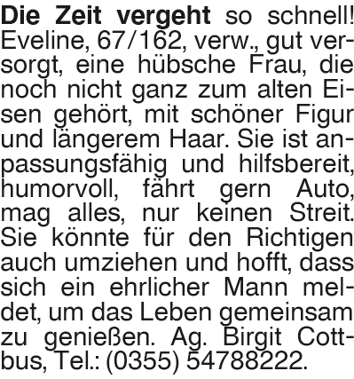 Eveline Die Zeit vergeht so schnell! Eveline, 67/162, verw., gut versorgt, eine hübsche Frau, die noch nicht ganz zum alten Eisen gehört, mit schöner Figur und längerem Haar. Sie ist anpassungsfähig und hilfsbereit, humorvoll, fährt gern Auto, mag alles, nur keinen Streit. Sie könnte für den Richtigen auch umziehen und hofft, dass sich ein ehrlicher Mann meldet, um das Leben gemeinsam zu genießen. Ag. Birgit Cottbus, Tel.: (0355) 54788222.