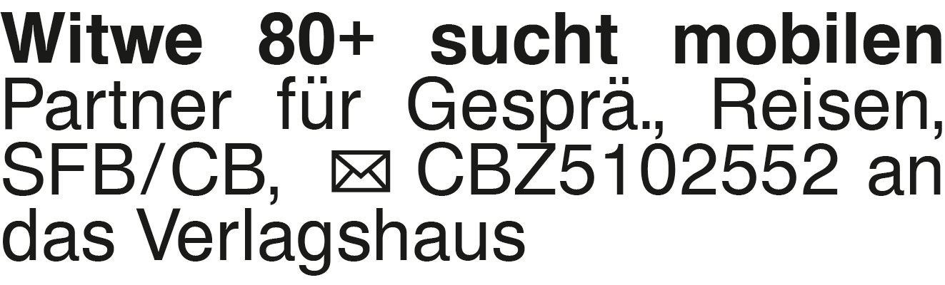 Witwe 80+ sucht mobilen P Witwe 80+ sucht mobilen Partner für Gesprä., Reisen, SFB/CB, CBZ5102552 an das VerlagshausDas könnte Sie auch interessieren