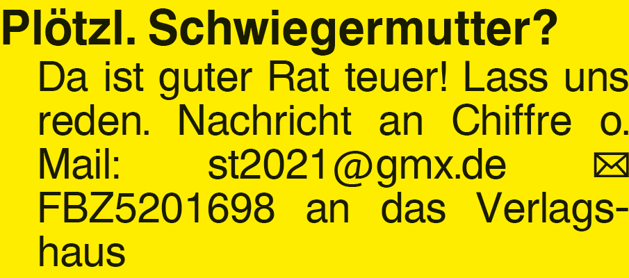 Plötzl. Schwiegermutter? Plötzl. Schwiegermutter? Da ist guter Rat teuer! Lass uns reden. Nachricht an Chiffre o. Mail: st2021@gmx.de FBZ5201698 an das VerlagshausDas könnte Sie auch interessieren