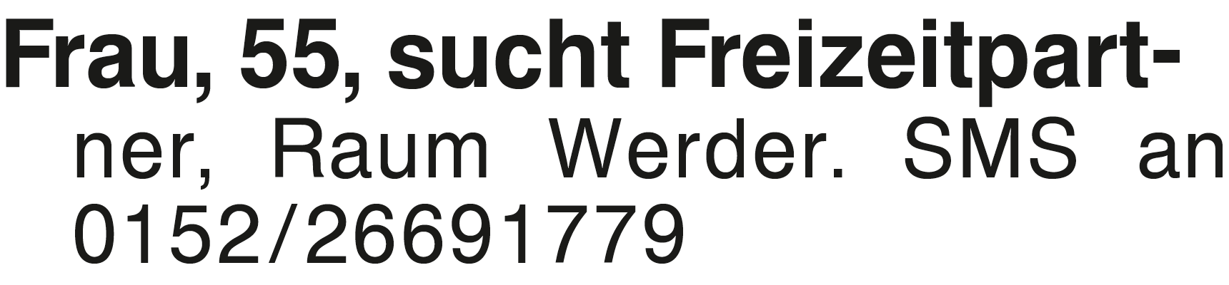 Frau, 55, sucht Freizeitp Frau, 55, sucht Freizeitpart- ner, Raum Werder. SMS an 0152/26691779Das könnte Sie auch interessieren