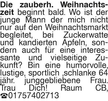 Die zauberh. Weihnachtsze Die zauberh. Weihnachtszeit beginnt bald. Wo ist der junge Mann der mich nicht nur auf den Weihnachtsmarkt begleitet, bei Zuckerwatte und kandierten Äpfeln, sondern auch für eine interessante und vielseitige Zukunft? Bin eine humorvolle, lustige, sportlich ,schlanke 64 jähr. junggebliebene Frau. Trau Dich! Raum CB, 01757402713Das könnte Sie auch interessieren