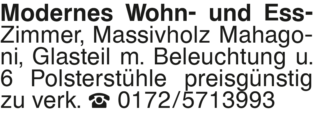 Modernes Wohn- und Ess- Z Modernes Wohn- und Ess- Zimmer, Massivholz Mahagoni, Glasteil m. Beleuchtung u. 6 Polsterstühle preisgünstig zu verk. 0172/5713993Das könnte Sie auch interessieren