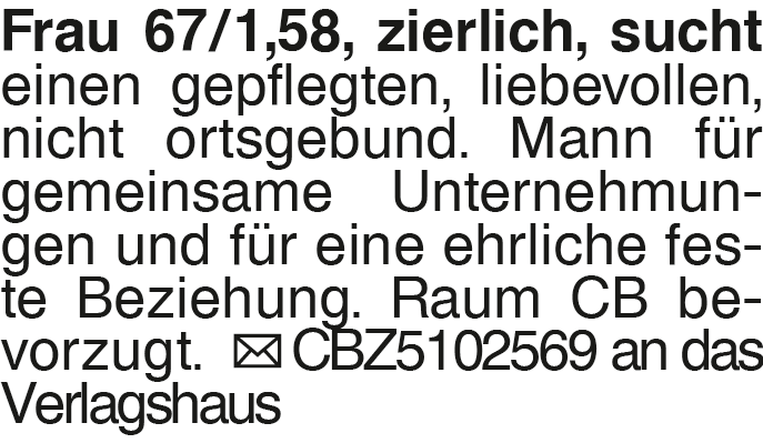Frau 67/1,58, zierlich, s Frau 67/1,58, zierlich, sucht einen gepflegten, liebevollen, nicht ortsgebund. Mann für gemeinsame Unternehmungen und für eine ehrliche feste Beziehung. Raum CB bevorzugt. CBZ5102569 an das VerlagshausDas könnte Sie auch interessieren