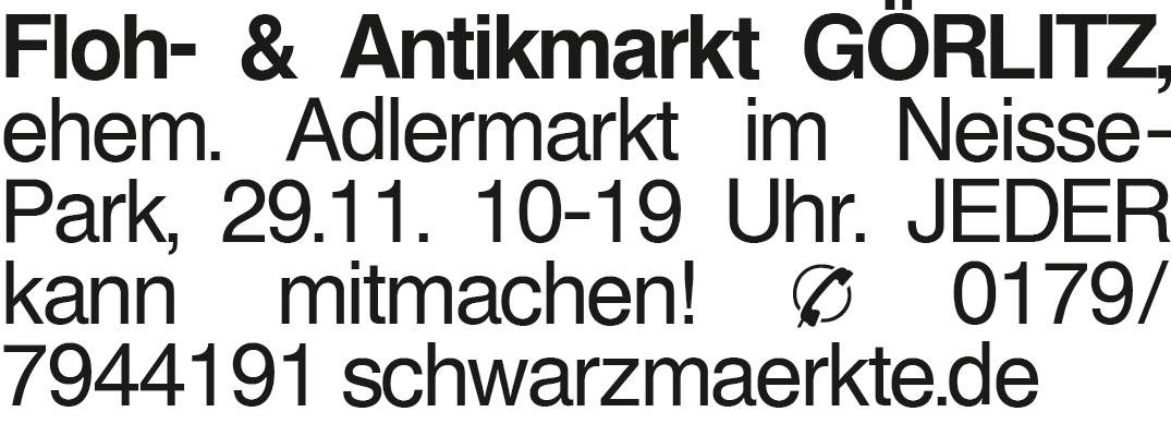 Floh- & Antikmarkt GÖRLIT Floh- & Antikmarkt GÖRLITZ, ehem. Adlermarkt im NeissePark, 29.11. 10-19 Uhr. JEDER kann mitmachen! 0179/7944191 schwarzmaerkte.deDas könnte Sie auch interessieren