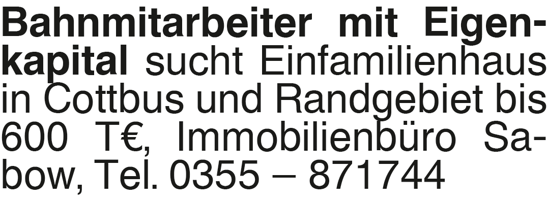 Bahnmitarbeiter mit Eigen Bahnmitarbeiter mit Eigenkapital sucht Einfamilienhaus in Cottbus und Randgebiet bis 600 T EUR, Immobilienbüro Sabow, Tel. 0355 # 871744Das könnte Sie auch interessieren