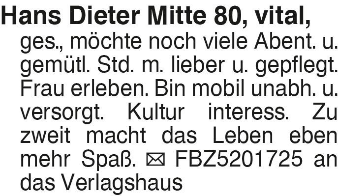 Hans Dieter Mitte 80, vit Hans Dieter Mitte 80, vital, ges., möchte noch viele Abent. u. gemütl. Std. m. lieber u. gepflegt. Frau erleben. Bin mobil unabh. u. versorgt. Kultur interess. Zu zweit macht das Leben eben mehr Spaß. FBZ5201725 an das VerlagshausDas könnte Sie auch interessieren