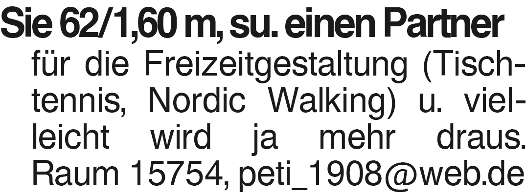 Sie 62/1,60 m, su. einen Sie 62/1,60 m, su. einen Partner für die Freizeitgestaltung (Tischtennis, Nordic Walking) u. vielleicht wird ja mehr draus. Raum 15754, peti_1908@web.deDas könnte Sie auch interessieren