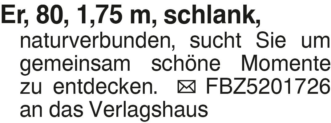 Er 80 1,75 m schlank natu Er, 80, 1,75 m, schlank, naturverbunden, sucht Sie um gemeinsam schöne Momente zu entdecken. FBZ5201726 an das Verlagshaus