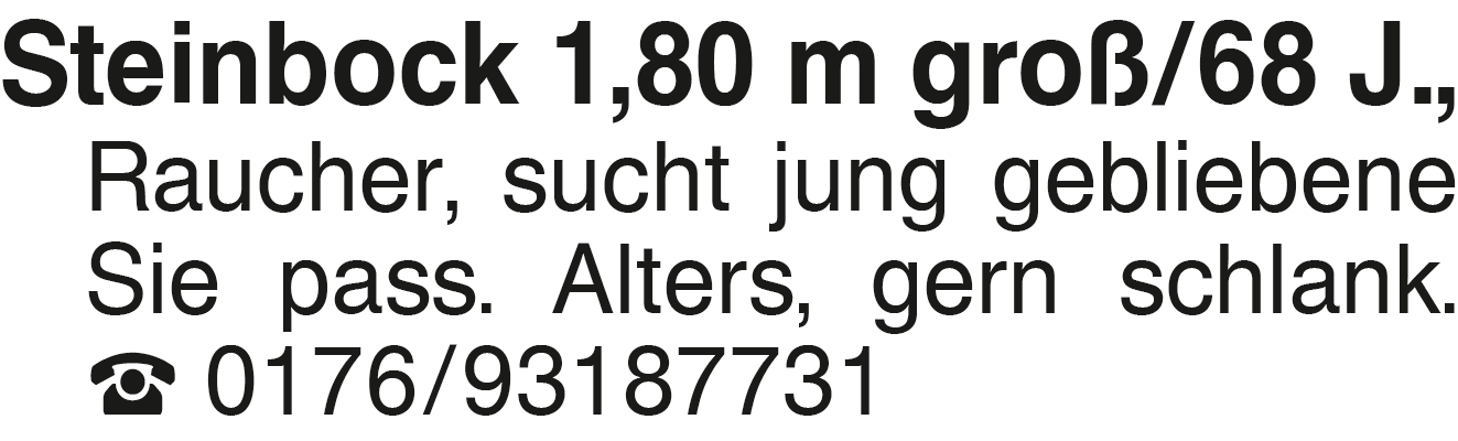 Steinbock 1,80 m groß/68 Steinbock 1,80 m groß/68 J., Raucher, sucht jung gebliebene Sie pass. Alters, gern schlank. 0176/93187731Das könnte Sie auch interessieren