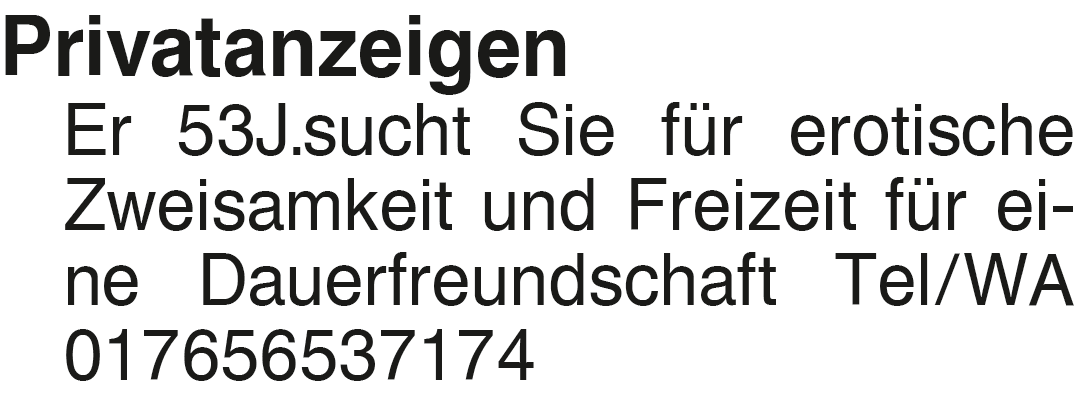 Privatanzeigen Er 53J.suc Er 53J.sucht Sie für erotische Zweisamkeit und Freizeit für eine Dauerfreundschaft Tel/WA 017656537174 VolkZwill@gmail.com