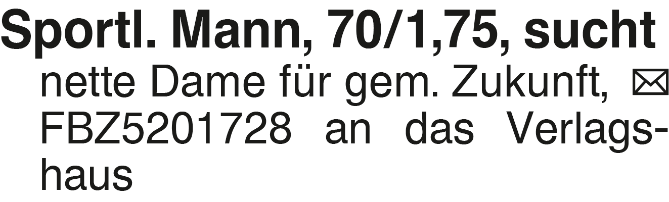 Sportl. Mann, 70/1,75, su Sportl. Mann, 70/1,75, sucht nette Dame für gem. Zukunft, FBZ5201728 an das VerlagshausDas könnte Sie auch interessieren