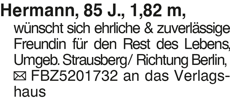 Hermann, 85 J., 1,82 m Hermann, 85 J., 1,82 m, wünscht sich ehrliche & zuverlässige Freundin für den Rest des Lebens, Umgeb. Strausberg/ Richtung Berlin, FBZ5201732 an das VerlagshausDas könnte Sie auch interessieren