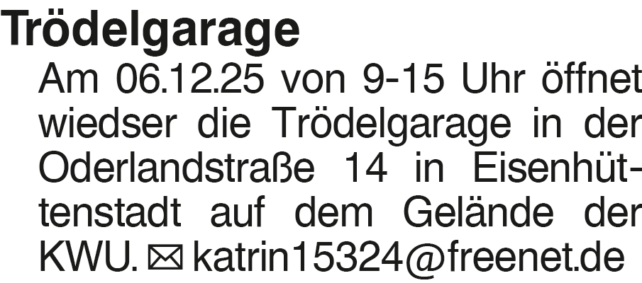Trödelgarage Am 08.11 Trödelgarage Am 06.12.25 von 9-15 Uhr öffnet wiedser die Trödelgarage in der Oderlandstraße 14 in Eisenhüttenstadt auf dem Gelände der KWU. katrin15324@freenet.deDas könnte Sie auch interessieren