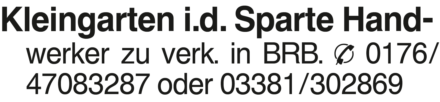 Kleingarten i.d. Sparte H Kleingarten i.d. Sparte Hand- werker zu verk. in BRB. 0176/47083287 oder 03381/302869Kontakt