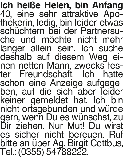 Helen Ich heiße Helen, bin Anfang 40, eine sehr attraktive Apothekerin, ledig, bin leider etwas schüchtern bei der Partnersuche und möchte nicht mehr länger allein sein. Ich suche deshalb auf diesem Weg einen netten Mann, zwecks fester Freundschaft. Ich hatte schon eine Anzeige aufgegeben, auf die sich aber leider keiner gemeldet hat. Ich bin nicht ortsgebunden und würde gern, wenn Du es wünschst, zu Dir ziehen. Nur Mut! Du wirst es sicher nicht bereuen. Ruf bitte an über Ag. Birgit Cottbus, Tel.: (0355) 54788222.Das könnte Sie auch interessieren