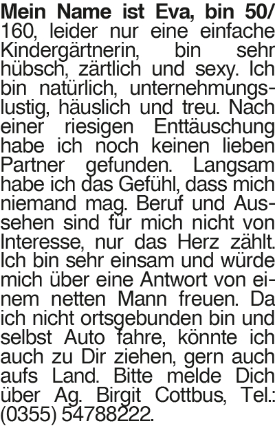 Eva Mein Name ist Eva, bin 50/160, leider nur eine einfache Kindergärtnerin, bin sehr hübsch, zärtlich und sexy. Ich bin natürlich, unternehmungslustig, häuslich und treu. Nach einer riesigen Enttäuschung habe ich noch keinen lieben Partner gefunden. Langsam habe ich das Gefühl, dass mich niemand mag. Beruf und Aussehen sind für mich nicht von Interesse, nur das Herz zählt. Ich bin sehr einsam und würde mich über eine Antwort von einem netten Mann freuen. Da ich nicht ortsgebunden bin und selbst Auto fahre, könnte ich auch zu Dir ziehen, gern auch aufs Land. Bitte melde Dich über Ag. Birgit Cottbus, Tel.: (0355) 54788222.Das könnte Sie auch interessieren