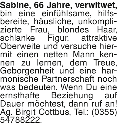 Sabine Sabine, 66 Jahre, verwitwet, bin eine einfühlsame, hilfs- bereite, häusliche, unkomplizierte Frau, blondes Haar, schlanke Figur, attraktive Oberweite und versuche hiermit einen netten Mann kennen zu lernen, dem Treue, Geborgenheit und eine harmonische Partnerschaft noch was bedeuten. Wenn Du eine ernsthafte Beziehung auf Dauer möchtest, dann ruf an! Ag. Birgit Cottbus, Tel.: (0355) 54788222.Das könnte Sie auch interessieren