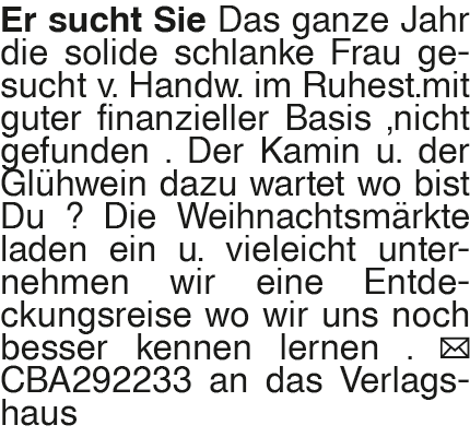 Er sucht Sie Das ganze Ja Das ganze Jahr die solide schlanke Frau gesucht v. Handw. im Ruhest.mit guter finanzieller Basis ,nicht gefunden . Der Kamin u. der Glühwein dazu wartet wo bist Du ? Die Weihnachtsmärkte laden ein u. vieleicht unternehmen wir eine Entdeckungsreise wo wir uns noch besser kennen lernen .Das könnte Sie auch interessieren
