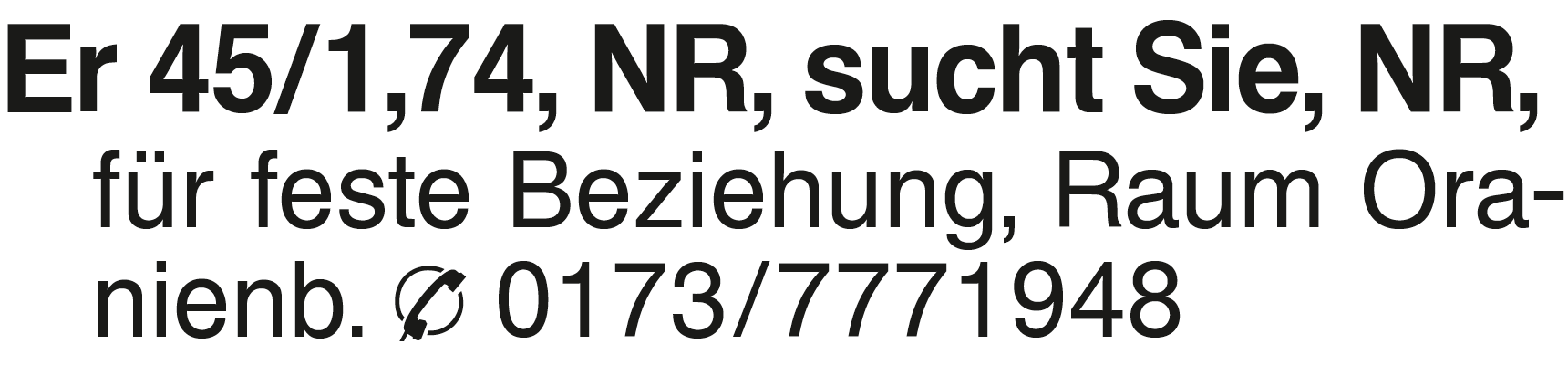 Er 45/1,74, NR, sucht Sie Er 45/1,74, NR, sucht Sie, NR, für feste Beziehung, Raum Oranienb. 0173/7771948Das könnte Sie auch interessieren
