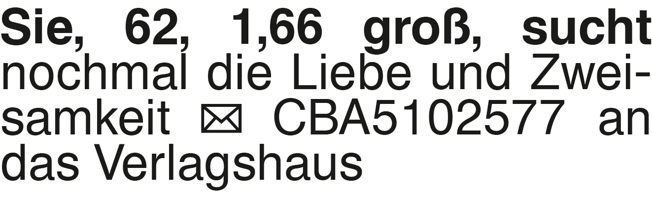 Sie, 62, 1,66 groß, sucht Sie, 62, 1,66 groß, sucht nochmal die Liebe und Zweisamkeit CBA5102577 an das VerlagshausDas könnte Sie auch interessieren