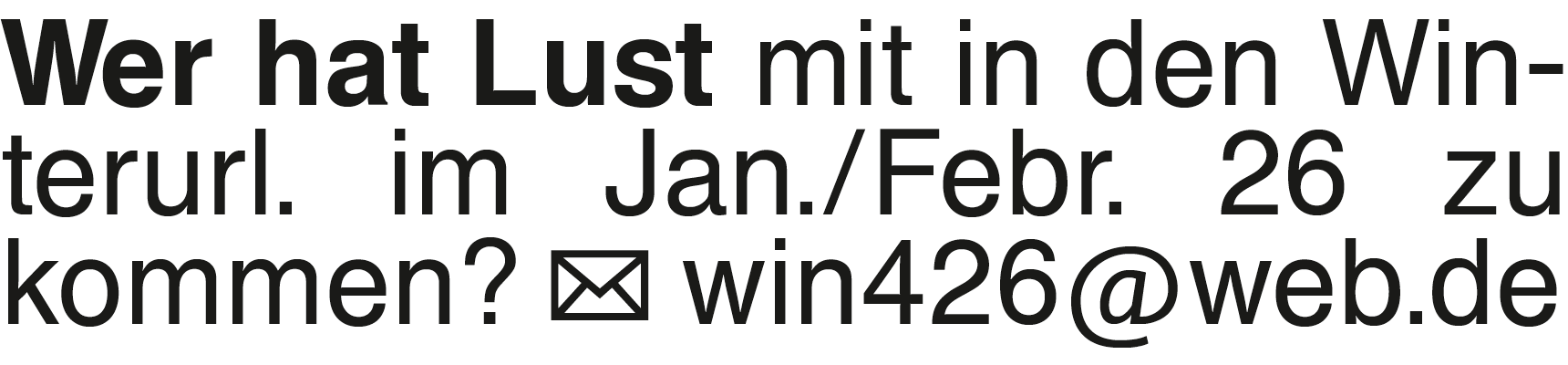 Wer hat Lust mit in den W mit in den Winterurl. im Jan./Febr. 26 zu kommen? win426@web.de