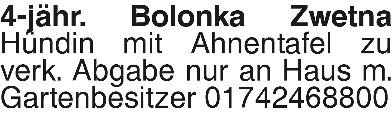 4-jähr. Bolonka Zwetna Hü 4-jähr. Bolonka Zwetna Hündin mit Ahnentafel zu verk. Abgabe nur an Haus m. Gartenbesitzer 01742468800Das könnte Sie auch interessieren
