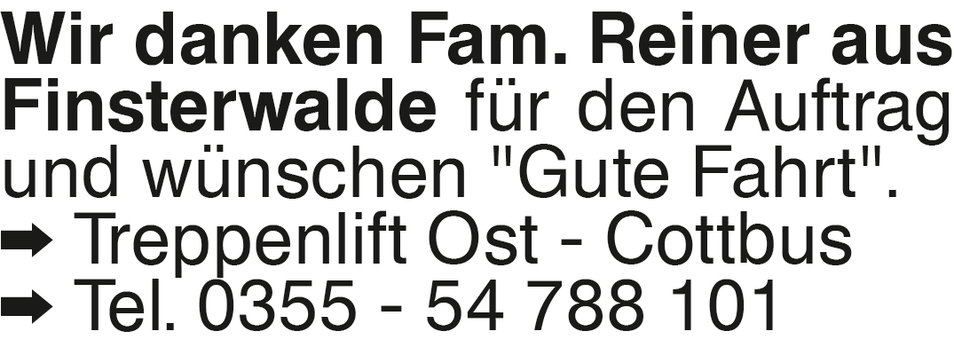 Wir danken Fam. Reiner Wir danken Fam. Reiner aus Finsterwalde für den Auftrag und wünschen Gute Fahrt . Treppenlift Ost - Cottbus Tel. 0355 - 54 788 101Das könnte Sie auch interessieren