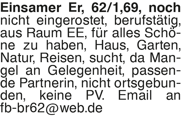 Einsamer Er, 62/1,69, noc Einsamer Er, 62/1,69, noch nicht eingerostet, berufstätig, aus Raum EE, für alles Schö- ne zu haben, Haus, Garten, Natur, Reisen, sucht, da Man- gel an Gelegenheit, passen- de Partnerin, nicht ortsgebun- den, keine PV. Email an fb-br62@web.deDas könnte Sie auch interessieren