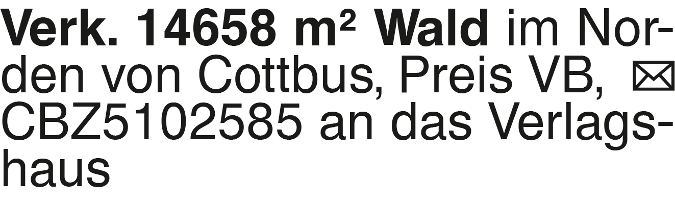 Verk. 14658 m2 Wald im No Verk. 14658 m2 Wald im Norden von Cottbus, Preis VB, CBZ5102585 an das Verlagshaus