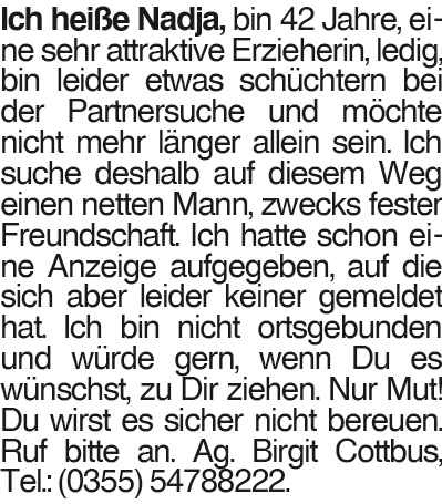 Nadja Ich heiße Nadja, bin 42 Jahre, eine sehr attraktive Erzieherin, ledig, bin leider etwas schüchtern bei der Partnersuche und möchte nicht mehr länger allein sein. Ich suche deshalb auf diesem Weg einen netten Mann, zwecks fester Freundschaft. Ich hatte schon eine Anzeige aufgegeben, auf die sich aber leider keiner gemeldet hat. Ich bin nicht ortsgebunden und würde gern, wenn Du es wünschst, zu Dir ziehen. Nur Mut! Du wirst es sicher nicht bereuen. Ruf bitte an. Ag. Birgit Cottbus, Tel.: (0355) 54788222.