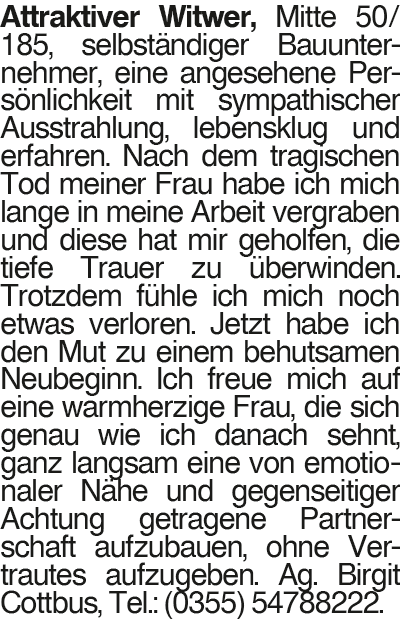 Attrakt. Witwer Mitte 50 Attraktiver Witwer, Mitte 50/185, selbständiger Bauunternehmer, eine angesehene Persönlichkeit mit sympathischer Ausstrahlung, lebensklug und erfahren. Nach dem tragischen Tod meiner Frau habe ich mich lange in meine Arbeit vergraben und diese hat mir geholfen, die tiefe Trauer zu überwinden. Trotzdem fühle ich mich noch etwas verloren. Jetzt habe ich den Mut zu einem behutsamen Neubeginn. Ich freue mich auf eine warmherzige Frau, die sich genau wie ich danach sehnt, ganz langsam eine von emotionaler Nähe und gegenseitiger Achtung getragene Partnerschaft aufzubauen, ohne Vertrautes aufzugeben. Ag. Birgit Cottbus, Tel.: (0355) 54788222.