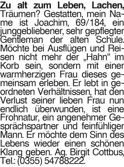Joachim Zu alt zum Leben, Lachen, Träumen? Gestatten, mein Name ist Joachim, 69/184, ein junggebliebener, sehr gepflegter Gentleman der alten Schule. Möchte bei Ausflügen und Reisen nicht mehr der Hahn im Korb sein, sondern mit einer warmherzigen Frau dieses gemeinsam erleben. Er lebt in geordneten Verhältnissen, hat den Verlust seiner lieben Frau nun endlich überwunden, ist eine Frohnatur, ein angenehmer Gesprächspartner und feinfühliger Mann. Er möchte dem Sinn des Lebens wieder einen schönen Klang geben. Ag. Birgit Cottbus, Tel.: (0355) 54788222.Das könnte Sie auch interessieren