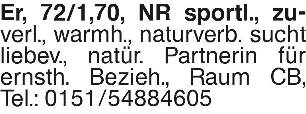 Er, 72/1,70, NR sportl., Er, 72/1,70, NR sportl., zuverl., warmh., naturverb. sucht liebev., natür. Partnerin für ernsth. Bezieh., Raum CB, Tel.: 0151/54884605Das könnte Sie auch interessieren