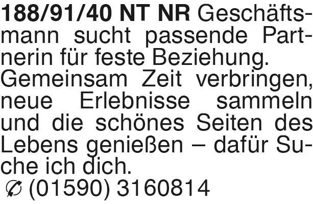 188/91/40 NT NR Geschäfts Geschäftsmann sucht passende Partnerin für feste Beziehung. Gemeinsam Zeit verbringen, neue Erlebnisse sammeln und die schönes Seiten des Lebens genießen # dafür Suche ich dich. Tel. (01590) 3160814Das könnte Sie auch interessieren