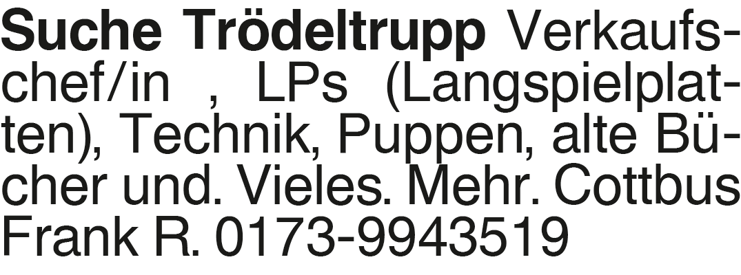 Suche Trödeltrupp Verkauf Suche Trödeltrupp Verkaufschef/in , LPs (Langspielplatten), Technik, Puppen, alte Bücher und. Vieles. Mehr. Cottbus Frank R. 0173-9943519