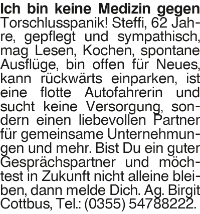 Steffi 62 Ich bin keine Medizin gegen Torschlusspanik! Steffi, 62 Jahre, gepflegt und sympathisch, mag Lesen, Kochen, spontane Ausflüge, bin offen für Neues, kann rückwärts einparken, ist eine flotte Autofahrerin und sucht keine Versorgung, sondern einen liebevollen Partner für gemeinsame Unternehmungen und mehr. Bist Du ein guter Gesprächspartner und möchtest in Zukunft nicht alleine bleiben, dann melde Dich. Ag. Birgit Cottbus, Tel.: (0355) 54788222.