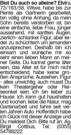 Elvira 73 Bist Du auch so alleine? Elvira, 73/163/58, Witwe, habe bis zur Rente als Gärtnerin gearbeitet, bin völlig ohne Anhang, da mein Sohn bereits verstorben ist, bin eine einfache, liebe Frau, jünger aussehend, mit sanften Augen, zierlich- schlanker Figur, aber leider zu schüchtern um jemanden anzusprechen. Deshalb bin ich einsam und wünsche mir so sehr einen lieben Mann an meiner Seite. Du kannst gerne älter sein, das Alter ist für mich nicht entscheidend, habe keine großen Ansprüche, Aussehen, Figur - alles unwichtig, auch musst Du kein Theatergeher oder Reiseonkel sein, ich bin lieber zu Hause. Ich kann gut haushalten und kochen, liebe die Natur, mag Gartenarbeit und fahre seit vielen Jahren Auto. Hoffentlich habe ich Glück mit dieser Anzeige und Du meldest Dich. Bitte ruf an. Ag. Birgit Cottbus, Tel.: (0355) 54788222.Das könnte Sie auch interessieren