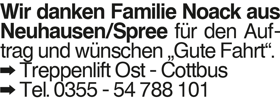 Wir danken Familie Noack Wir danken Familie Noack aus Neuhausen/Spree für den Auftrag und wünschen Gute Fahrt . Treppenlift Ost - Cottbus Tel. 0355 - 54 788 101Das könnte Sie auch interessieren