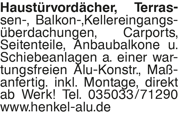 Haustürvordächer, Terrass Haustürvordächer, Terrassen-, Balkon-,Kellereingangsüberdachungen, Carports, Seitenteile, Anbaubalkone u. Schiebeanlagen a. einer wartungsfreien Alu-Konstr., Maßanfertig. inkl. Montage, direkt ab Werk! Tel. 035033/71290 www.henkel-alu.deDas könnte Sie auch interessieren