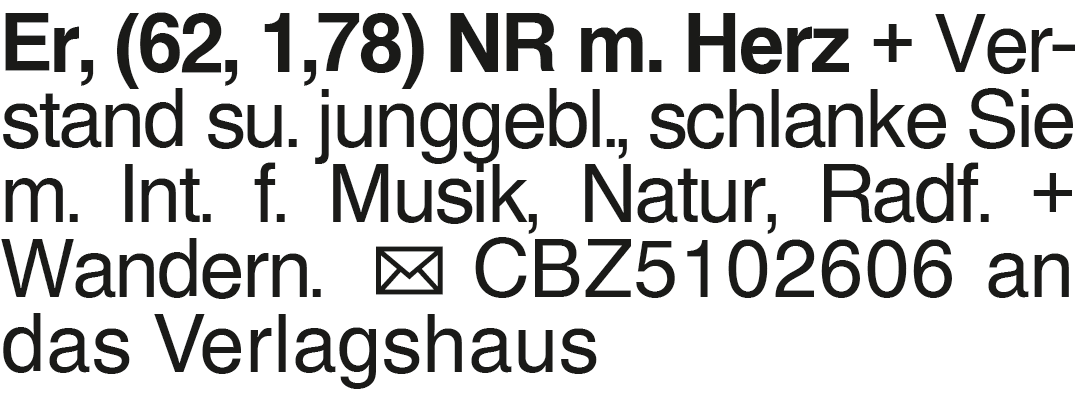 Er, (62, 1,78) NR m. Herz Er, (62, 1,78) NR m. Herz + Verstand su. junggebl., schlanke Sie m. Int. f. Musik, Natur, Radf. + Wandern. CBZ5102606 an das VerlagshausDas könnte Sie auch interessieren