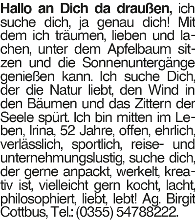 Irina 52 Hallo an Dich da draußen, ich suche dich, ja genau dich! Mit dem ich träumen, lieben und lachen, unter dem Apfelbaum sitzen und die Sonnenuntergänge genießen kann. Ich suche Dich, der die Natur liebt, den Wind in den Bäumen und das Zittern der Seele spürt. Ich bin mitten im Leben, Irina, 52 Jahre, offen, ehrlich, verlässlich, sportlich, reise- und unternehmungslustig, suche dich, der gerne anpackt, werkelt, kreativ ist, vielleicht gern kocht, lacht, philosophiert, liebt, lebt! Ag. Birgit Cottbus, Tel.: (0355) 54788222.