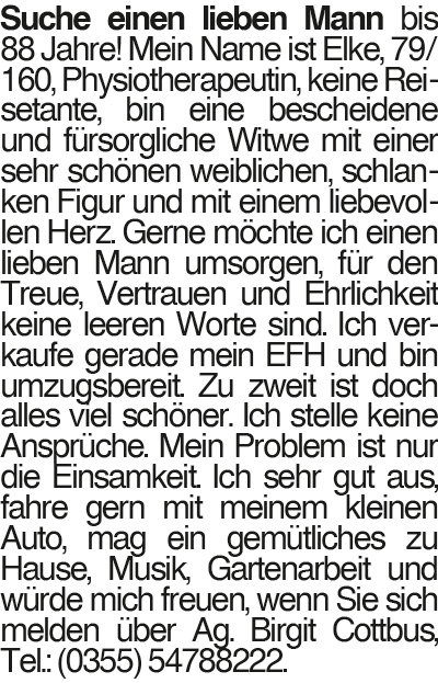 Elke, 79 Suche einen lieben Mann bis 88 Jahre! Mein Name ist Elke, 79/160, Physiotherapeutin, keine Reisetante, bin eine bescheidene und fürsorgliche Witwe mit einer sehr schönen weiblichen, schlanken Figur und mit einem liebevollen Herz. Gerne möchte ich einen lieben Mann umsorgen, für den Treue, Vertrauen und Ehrlichkeit keine leeren Worte sind. Ich verkaufe gerade mein EFH und bin umzugsbereit. Zu zweit ist doch alles viel schöner. Ich stelle keine Ansprüche. Mein Problem ist nur die Einsamkeit. Ich sehr gut aus, fahre gern mit meinem kleinen Auto, mag ein gemütliches zu Hause, Musik, Gartenarbeit und würde mich freuen, wenn Sie sich melden über Ag. Birgit Cottbus, Tel.: (0355) 54788222.