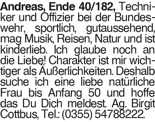 Andreas, Ende 40 Andreas, Ende 40/182, Techniker und Offizier bei der Bundeswehr, sportlich, gutaussehend, mag Musik, Reisen, Natur und ist kinderlieb. Ich glaube noch an die Liebe! Charakter ist mir wichtiger als Äußerlichkeiten. Deshalb suche ich eine liebe natürliche Frau bis Anfang 50 und hoffe das Du Dich meldest. Ag. Birgit Cottbus, Tel.: (0355) 54788222.