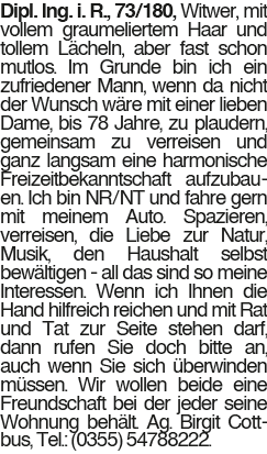 Dipl.-Ing. i. R. Dipl. Ing. i. R., 73/180, Witwer, mit vollem graumeliertem Haar und tollem Lächeln, aber fast schon mutlos. Im Grunde bin ich ein zufriedener Mann, wenn da nicht der Wunsch wäre mit einer lieben Dame, bis 78 Jahre, zu plaudern, gemeinsam zu verreisen und ganz langsam eine harmonische Freizeitbekanntschaft aufzubauen. Ich bin NR/NT und fahre gern mit meinem Auto. Spazieren, verreisen, die Liebe zur Natur, Musik, den Haushalt selbst bewältigen - all das sind so meine Interessen. Wenn ich Ihnen die Hand hilfreich reichen und mit Rat und Tat zur Seite stehen darf, dann rufen Sie doch bitte an, auch wenn Sie sich überwinden müssen. Wir wollen beide eine Freundschaft bei der jeder seine Wohnung behält. Ag. Birgit Cottbus, Tel.: (0355) 54788222.Das könnte Sie auch interessieren